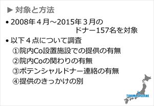 2008年4月から2015年3月までのドナー157名を対象とし、①院内Co設置施設での提供の有無、②院内Coの関わりの有無、③ポテンシャルドナー連絡の有無、④提供のきっかけの有無(献眼登録・意思表示・家族の申し出・オプション提示(以下OP提示=献眼の選択肢を提示すること))、の4点について調査した。