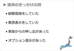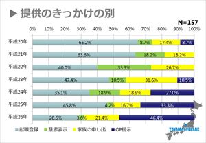 割合では、まず献眼登録など書面による意思表示からの提供の割合が減少してきている。一方、右の濃い青色、オプション提示によるご提供の割合が増えてきている。